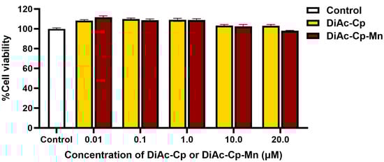 To evaluate the effect of DiAc-Cp and DiAc-Cp-Mn on cell viability, SH-SY5Y cells were treated with various concentrations of DiAc-Cp and DiAc-Cp-Mn (0.01, 0.1, 1.0, 10.0, and 20.0 μM) for 24 h. The cell viability was determined using an MTT assay. As shown in Figure 2, treatment of SH-SY5Y cells with DiAc-Cp and DiAc-Cp-Mn at concentrations ranging from 0.01 to 20.0 μM for 24 h did not affect cell viability compared to the control group.