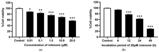 (a) Rotenone-induced neurotoxicity for 24 h in SH-SY5Y cells showed a dose-dependent reduction in cell viability, determined by an MTT assay. (b) 20 µM rotenone-induced neurotoxicity in SH-SY5Y cells was determined by MTT assay. Values are reported as the percentage of the untreated control and represent the mean ± SEM (n = 6). Significance was calculated using ANOVA [* = p < 0.05, ** = p < 0.01, and *** = p < 0.001] compared to the control.