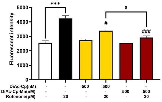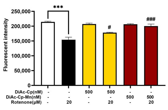The accumulation of intracellular ROS was measured by spectrofluorometry, using 2,7-dichloro-dihydrofluorescein diacetate (DCFH-DA) (InvitrogenTM, Eugene, OR, USA). Non-fluorescent DCFH-DA is converted to DCFH by cellular esterase, and DCFH is oxidized by ROS to form fluorescent dichlorofluorescein (DCF). After pretreatment for 4 h with DiAc-Cp-Mn or DiAc-Cp following incubation with 20 µM rotenone for 6 h, SH-SY5Y cells were incubated with DCFH-DA at a concentration of 20 µM for 30 min at 37 °C. After washing twice with PBS, the fluorescence intensity was measured at 488 nm (excitation) and 525 nm (emission) using a fluorescence microplate reader [39].
