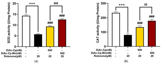 SOD catalyzes the dismutation of O2•− to H2O2 and O2. The catalytic breakdown of hydrogen peroxide into water and oxygen is catalyzed by CAT. Cells can be protected against oxidative damage by SOD and CAT [18]. The activities of SOD and CAT in SH-SY5Y cells were determined using the commercial SOD19160 Assay Kit and the CAT100 Catalase Assay Kit. (Sigma-Aldrich, St. Louis, MO, USA), respectively. For the SOD activity assay, after pretreatment for 4 h with DiAc-Cp-Mn or DiAc-Cp following incubation with 20 µM rotenone for 6 h, SH-SY5Y cells were gently trypsinized and transferred to an ice-cold tube. The cells were centrifuged at 250× g for 10 min at 4 °C, and the supernatant was discarded. Then, the cell pellets were washed with ice-cold PBS and homogenized in 0.5–1.0 mL of cold PBS per 100 mg of cells. The cells were centrifuged at 1500× g for 10 min at 4 °C. The supernatant was then collected for assaying. For the CAT activity assay, after pretreatment for 4 h with DiAc-Cp-Mn or DiAc-Cp following incubation with 20 µM rotenone for 6 h, SH-SY5Y cells were gently dislodged with a rubber policeman and transferred to a tube on ice. The cells were centrifuged at 250× g for 10 min at 4 °C and the supernatant was discarded. The cell pellets were washed with ice-cold PBS and homogenized in 1.0–2.0 mL of cold 1× assay buffer per 100 mg of cells. The cells were centrifuged at 10,000 rpm for 15 min at 4 °C. The supernatant was then collected for assaying. The total protein concentration in the sample, as determined by the Bradford method, was used to normalize all antioxidant enzyme activity. SOD and CAT activities are expressed as U/mg protein [40].