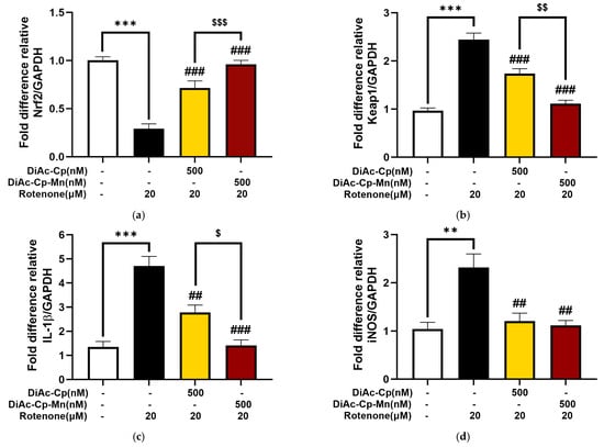 To explore the molecular mechanisms that might underlie the neuroprotective effect of DiAc-Cp-Mn, Nrf2/Keap1 (anti-oxidative defense regulation) and IL-1β/iNOS (inflammatory mediator) mRNA expressions were measured by q-PCR. Fold differences relative to the GAPDH housekeeping gene were used to quantify the expression levels. As shown in Figure 8, rotenone exposure significantly increased the expression of Keap1, IL-1β, and iNOS mRNA and decreased the expression of Nrf2 mRNA, compared to the control. Treatment of 500 nM DiAc-Cp and 500 nM DiAc-Cp-Mn before rotenone exposure significantly improved the expression of Nrf2, Keap1, IL-1β, and iNOS. Additionally, DiAc-Cp-Mn raised the expression of Nrf2 and diminished the expression of Keap1 and IL-1β more than DiAc-Cp.