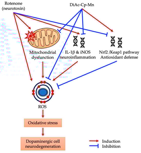 Additionally, rotenone-induced neuroinflammation by increases the levels of IL-1β, TNF-α, IL-6, and NO in SNpc [30]. The NF-κB signaling cascade is activated to intensify the inflammatory response. NF-κB is activated in the nucleus and binds to specific sites on DNA to regulate the expression of IL-1β, TNF-α, iNOS, and COX-2. The previous in vitro and in vivo studies showed that DiAc-Cp-Mn had strong NO radical scavenging activity [21]. DiAc-Cp-Mn protected against kainic acid-induced increases in NO levels, which cause neuronal cell death, in the rat hippocampus by their ability to scavenge NO and its antioxidative properties [11]. The previous reports showed that DiAc-Cp-Mn had anti-inflammatory activity by reducing the expression of COX-2 and iNOS on kainic acid-induced neurotoxicity in the rat hippocampus [12]. Consistent with the previous finding, the pretreatment with Mn complex attenuated rotenone-induced inflammation via downregulation of iNOS and IL-1β mRNA expression. The regulation of iNOS mRNA expression depends on the formation of a multiple intracellular signaling complex composed of Janus kinases, protein tyrosine kinases, protein kinase C, and mitogen-activated protein kinases, as well as transcription systems such as nuclear factor kB (NF-kB) and activator protein 1 (AP-1) [12]. The down-regulation of nuclear NF-κB, a major pro-inflammatory signaling protein, leads to decreased neuroinflammation [35]. SOD mimics mitigated neuro-inflammation by reducing these pro-inflammatory cytokines. Figure 9 depicts the putative multi-modes of action of DiAc-Cp-Mn against rotenone-induced oxidative damage.
