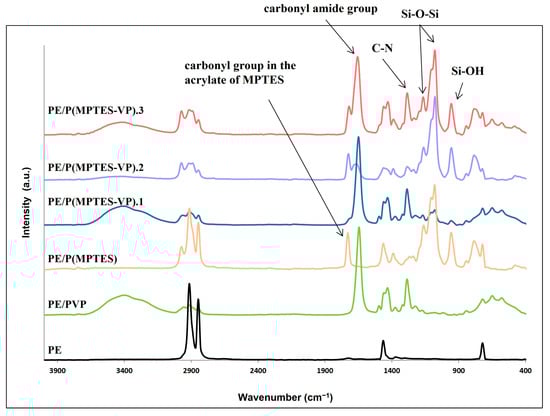 FTIR measurements (Figure 4) were performed to ensure the presence of the coating components and demonstrate the change in surface composition. The characteristic peaks of PE at 2850 and 2917 cm−1 (C-H asymmetric and symmetric stretching vibrations of methylene groups, respectively), 1473 cm−1 (C-H bending), and 731 cm−1 (C-C rocking) were clearly observed in the PE spectrum. Figure 4 shows Si-O-Si peaks at 1079 and 1107 cm−1 (asymmetric stretching vibration) and a medium band at 954 cm−1 (bending of the linear Si-OH stretching vibration) for MPTES and the three MPTES-VP films. As expected, these peaks are less pronounced in MPTES-VP.1 in accordance with the considerably lower concentration of MPTES.