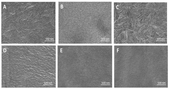 HRSEM images of PE (A), PE/P(MPTES-VP).1–3 (B–D), PE/P(MPTES) (E), and PE/PVP (F) films.