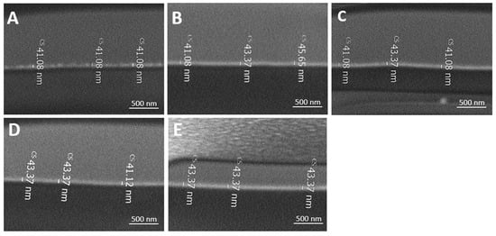 FIB was used to study the cross-section of the coating. The thickness of the surface-bonded layer was analyzed using cross-section images of the film. Cross-sections were prepared using a dual beam system (FIB-SEM) Helios 600 (FEI, Hilsboro, OR, USA), which included an FIB and a SEM column. The Ga+ ion beam impacts the sample perpendicularly while the incident electron beam is at a 52° angle to capture cross-section images.
