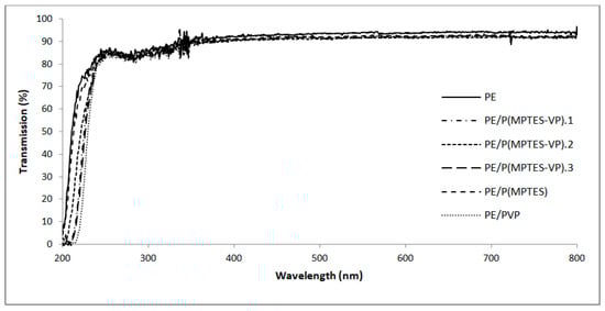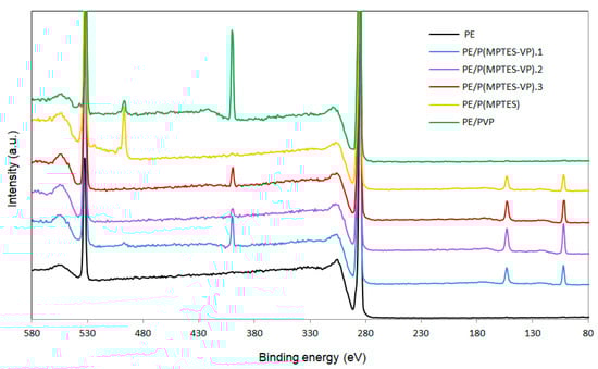 The very low Si content (0.17%) of the PVP coating was probably due to environmental contamination. Please note that the peak at 497 eV in the spectra of PE/P(MPTES) and PE/PVP (Figure 8) is probably related to the -CN nitrogen of the AIBN initiator [46]. It is hardly observed in the three P(MPTES-VP) coatings, as these polymers were produced in two steps: polymerization of MPTES and VP initiated by AIBN followed by polymerization of the produced silane–pyrrolidone monomer onto the film without AIBN. It should also be noted that the N peak of AIBN is significantly higher in P(MPTES) than in PVP. This may be explained by the higher molecular weight of PVP vs. P(MPTES), so that in each polymeric chain, the concentration of N belonging to the initiator is significantly lower.