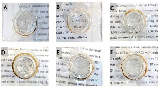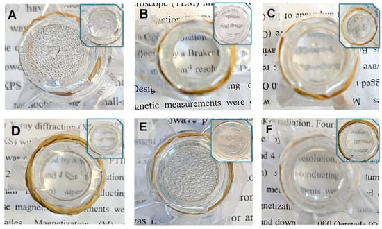 Non-coated and coated PE films after the hot-fog test: PE (A), PE/P(MPTES-VP).1 (B), PE/P(MPTES-VP).2 (C), PE/P(MPTES-VP).3 (D), PE/P(MPTES) (E), and PE/PVP (F). Pictures were taken 1 h after the water in the vial reached 70 °C (images after 24 h are shown in insets).