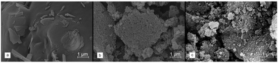 SEM images collected for spherical lignin precursor after (a) direct carbonization at 800 °C (heating rate of 1 °C·min−1), (b) stabilization at 250 °C (heating rate of 0.05 °C·min−1), and (c) carbonization at 800 °C (heating rate of 1 °C·min−1) preceded by stabilization at 250 °C (heating rate of 0.05 °C·min−1).