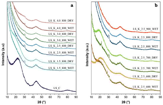 XRD patterns of selected activated carbons obtained on the basis of lignin: (a) LS modified with various amounts of K2CO3 (1.5–4.0 eq) and carbonized at 800 °C, and (b) LS modified with 2.5 eq of K2CO3 and carbonized at different temperatures (600–900 °C).