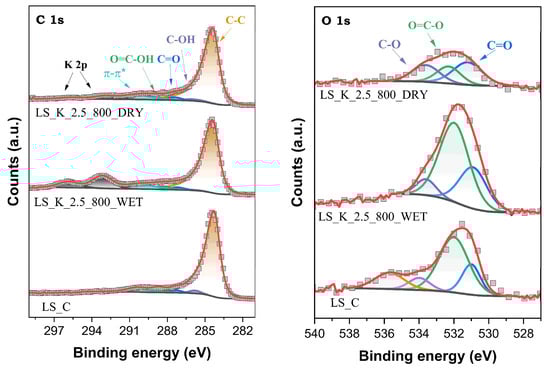 In the case of XPS O 1s spectra, the presence of three main components is identified at binding energies (Eb) of 531.0 ± 0.2, 532.1 ± 0.2, and 533.8 ± 0.2 eV, assigned to oxygen atoms in C=O, O=C–O, and C–O surface functionalities, respectively. Additionally, for LS_C carbon, the appearance of one more component at 535.7 eV, as attributed to photoelectron emission from H2O molecules, suggests the presence of moisture in this sample. In turn, in the XPS C 1s spectra, five components are found at 284.4 eV (C sp2 and sp3), 285.9 ± 0.1 eV (C–OH), 287.4 ± 0.2 eV (C=O), 288.6 ± 0.2 eV (COOH), and 290.4 ± 0.2 eV (π–π*) [60,61]. In the XPS C 1s spectra of lignin-derived carbons after activation, above the Eb values characteristic of C, additional signals appear from the emission of photoelectrons from K atoms, remaining in small amounts on the surface after treatment with K2CO3. The K 2p3/2 peak is observed at 293.1 ± 0.1 eV, and is accompanied by a spaced spin-orbit K 2p1/2 component with Δ = ~2.8 eV [62].