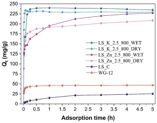 The developed carbon materials were tested as adsorbents of phenol from an aqueous solution. The adsorption tests were performed at room temperature. First, the kinetics of the process was studied in the presence of representative LS_K_2.5_800_WET and LS_K_2.5_800_DRY adsorbents, as well as analogously modified and carbonized LS_Zn_2.5_800_WET and LS_Zn_2.5_800_DRY materials, which were chemically activated with ZnCl2. The obtained results are presented in Figure 7, along with the kinetic data collected for non-activated carbon (LS_C) and commercial WG-12 activated carbon.