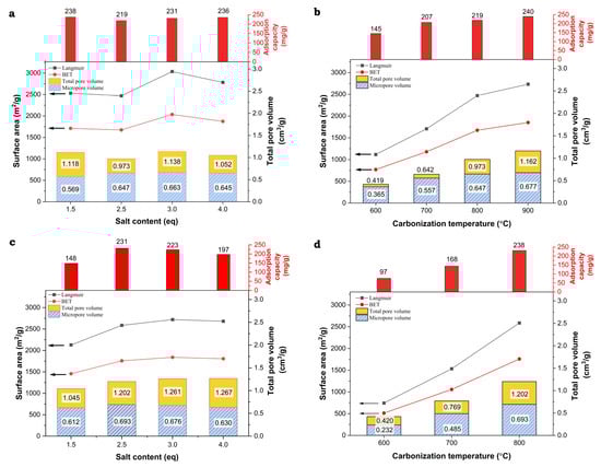 Correlations between structural parameters determined by N2 adsorption and phenol adsorption capacities for the lignin-derived activated carbons ((a)—LS_K_x_800_WET, (b)—LS_K_2.5_y_WET, (c)—LS_K_x_800_DRY, and (d)—LS_K_2.5_y_DRY).