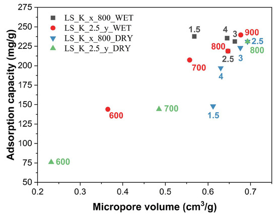 From an application point of view, in addition to the process rate, the adsorption capacities obtained for the investigated activated carbons are even more important. When using different amounts of the K2CO3 modifier, after carbonization at 800 °C, activated carbons show similar Qe values in the range of 219–238 mg·g−1. The exception are the samples synthesized by the DRY method, using the lowest and highest concentrations of K2CO3 (i.e., 1.5 eq and 4.0 eq), for which Qe drops to 148 and 197 mg·g−1, respectively. The Qe values for the carbons carbonized at different temperatures exhibit much clearer trends. Within the LS_K_2.5_y_WET series, Qe increases from 144 mg·g−1 for the sample heated at 600 °C, to 240 mg·g−1 for the material carbonized at 900 °C. An even greater change is observed in the LS_K_2.5_y_DRY series, where Qe increases from 76 to 231 mg·g−1 when the carbonization temperature raises from 600 °C to 800 °C.