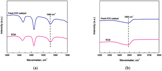 Figure 1 displays the Py-FTIR and DTBPy-FTIR spectra after desorption at 400 °C for fresh FCC catalyst and ECat. As it shown, the characteristic peaks at 1540 cm−1 and 3500 cm−1 could be attributed to the strong B acid sites that adsorbed by Py and DTBPy respectively [14].