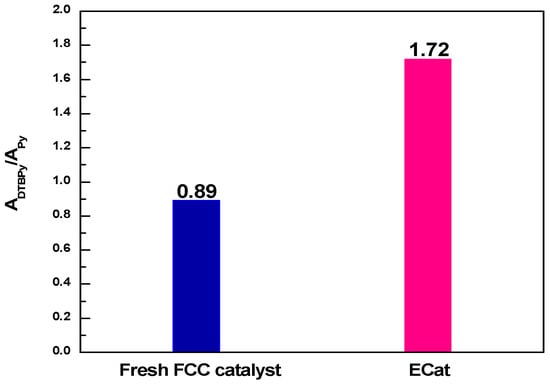 The ADTBPy/APy values derived from Figure 1 for fresh FCC catalyst and ECat are shown in Figure 2. As it shown, the ADTBPy/APy value for ECat is much bigger than that of fresh FCC catalyst, indicating that the strong acid sites accessibility of ECat for big heavy oil molecules would be obviously higher than that of fresh FCC catalyst, which fully demonstrates the above inference on the degeneration of ECat.