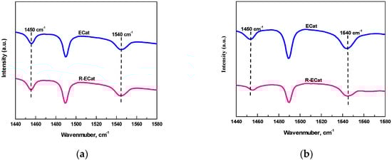 Py-FTIR spectra for ECat and R-ECat after desorption at 200 °C (a) and 400 °C (b).