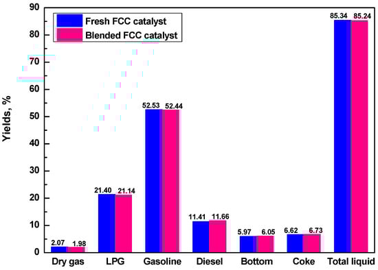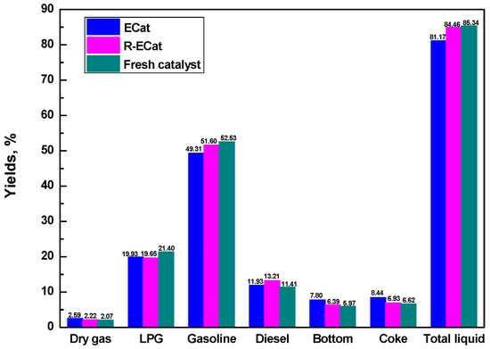 To confirm if the R-ECat could substitute for fresh FCC catalyst partially, the pure fresh FCC catalyst and blended catalyst that composited of 70% fresh FCC catalyst and 30% R-ECat were evaluated in one batch. As it shown in Figure 8, compared with fresh FCC catalyst, the heavy oil catalytic cracking performance of blended FCC catalyst is not visibly different, which indicate that the R-ECat in this work could be reused in FCC unit as substitute for partial fresh FCC catalyst without obvious influence on heavy oil catalytic cracking performance.