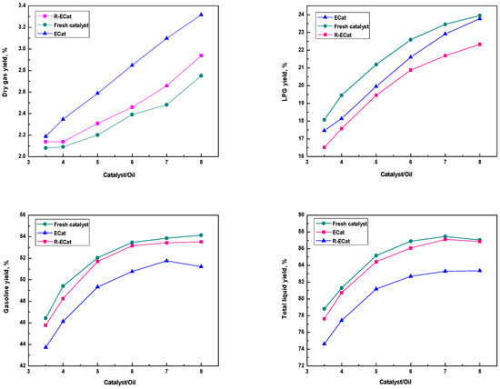 Heavy oil catalytic cracking performances for ECat, R-ECat and fresh catalyst at different catalyst/oil mass ratios.