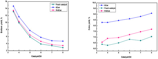 The heavy oil catalytic cracking performances for ECat, R-ECat and fresh catalyst at different catalyst/oil mass ratios were also investigated. As it shown in Figure 7, the gasoline and total liquid yields of R-ECat are much higher than that of ECat at different catalyst/oil mass ratios meanwhile with obviously lower dry gas and coke yields, which further demonstrate the excellent heavy oil catalytic cracking performance of R-ECat.