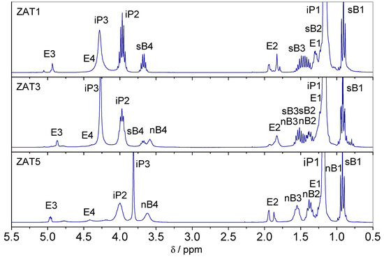 1H NMR spectra of samples ZAT1-ZAT5 after 24 h of hydrolysis are presented in Figure 1. Hydrogen atoms are labeled according to Figure 2. Assignments of spectra were performed on the basis of chemical shifts, signal intensities, magnitude and multiplicity, NMR spectra of pure precursors, chelating agents, and solvents, as well as on the basis of previous findings [12,13,14]. The most pronounced resonances in the spectra are those due to isopropanol at ~1.19 ppm for methyl protons (iP1), ~3.99 ppm for methine protons (iP2), and signals centered at 4.74 (ZAT1), 4.62 (ZAT2), 4.67 (ZAT3), 2.75 (ZAT4), and 4.34 (ZAT5) due to the hydroxyl group protons. The characteristic resonances of sec-butoxy groups of AsB occur at ~0.90 and ~1.16 (sB2) ppm for methyl protons, at ~1.42 and ~1.51 ppm for methylene protons, and at ~3.70 for methyne protons. The characteristic resonances of the n-butoxide groups of TnB occur at ~0.92 ppm for methyl protons and at ~1.37 ppm, ~1.55 ppm, and ~3.59 ppm for methylene protons. The intensities of signals are in concordance with the stoichiometry of the samples: the resonances of sec-butoxy groups of AsB are the most intense in the spectra of sample ZAT1, diminish in the spectra of sample ZAT4, and do not occur in the spectra of sample ZAT5. Of course, it is quite the opposite for the resonances of n-butoxy groups of TnB (most intense in the spectra of sample ZAT5 and non-existent in the spectra of sample ZAT1). No resonances due to sec-butanol and n-butanol released from alkoxides in the course of the chelation process could be observed.