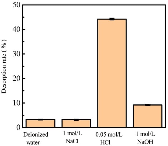 Alkali (NaOH), acid (HCl), salt (NaCl), and deionized water were used to investigate the influence of different adsorbents on phosphorus desorption at a liquid–solid ratio of 0.15 L/g at 35 °C for 18 h. Figure 1 shows phosphorus desorption from activated red mud particles after adsorption. The results indicate that, after 3 h of desorption in deionized water and a NaCl solution, the desorption rate of phosphorus is <10%, which is much lower than those for HCl and NaOH solutions under the same desorption conditions. The phosphorus desorption rate is in the following order: HCl solution > NaOH solution > NaCl solution > deionized water. However, the desorption of the 1.0 mol/L NaOH solution is inconsiderable, which may be due to the insufficient desorption time or desorbent concentration.