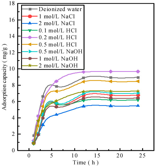 The activated red mud adsorbents after phosphorus desorption were used to readsorb phosphorus. Notably, 25 g/L of activated red mud adsorbents were injected into a 40 mL conical flask in a phosphorus-containing 300 mg/L solution at a constant temperature of 35 °C to undergo static adsorption for 1, 2, 3, 6, 12, 18, and 24 h. The concentration of phosphorus contained in the solution supernatant was determined through inductively coupled plasma (ICP) emission spectrometry. Figure 2 shows phosphorus resorption by the adsorbent after desorption. The resorption performances for deionized water and 0.2 and 0.5 mol/L HCl solutions are considerably better than those for a low-concentration HCl solution and any concentration of a NaOH solution. Figure 2 shows that 0.2–0.5 mol/L HCl does not destroy the particle structure and even dredges the particle pores, thereby exposing the effective sites inside the particles. This explains why the 0.2–0.5 mol/L HCl solution is better than deionized water. By combining desorption–readsorption and the loss of particles, a 0.2 mol/L HCl solution can serve as a desorbent for desorption and subsequent phosphorus readsorption studies of activated red mud adsorbents.