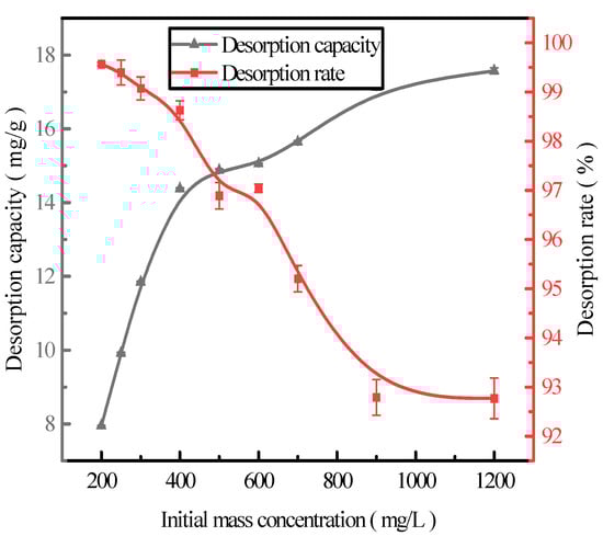 Here, we discuss the adsorption at the initial concentrations of 200, 250, 300, 400, 500, 600, 700, 900, and 1200 mg/L of activated red mud adsorbents (105 °C for 2 h) and the static desorption of 0.2 mol/L HCl with a desorbent and adsorbent liquid–solid ratio of 0.15 L/g (35 °C in a conical flask for 12 h). Once the phosphorous concentration in the solution supernatant is determined through ICP, the results are based on the amount of desorbed phosphorus. After the test, the phosphorus concentration in the solution supernatant was determined via ICP; the results are expressed in terms of the amount of phosphorus desorbed and the desorption rate in Figure 4. With increasing initial phosphorus concentration, the desorption of the desorbent for the phosphorus adsorbed by the adsorbents increased. The phosphorus desorption was 7.98 mg/g for an initial concentration of 200 mg/L, with a desorption rate of 99.57%, which was primarily attributed to the high adsorption rate. The main reason for this result is that high adsorption rates drove the desorption of the desorbent to the adsorbent, increasing the number of adsorption sites used on the particle surfaces and leading to better desorption. The desorption rate decreased with increasing initial phosphorus concentration, which was consistent with adsorption. The particles presented in Figure 4 show that the desorption rate of phosphorus adsorbed by the adsorbents exceeded 99% when the initial concentration was <300 mg/L. Thus, high-efficiency phosphorus removal was realized.