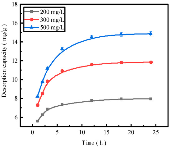 The reaction time is also an important factor affecting the desorption effect of the desorbent on pollutants. We use activated red mud adsorbent for adsorption at 105 °C (drying for 2 h), a desorbent and adsorbent liquid–solid ratio of 0.15 L/g, and the initial concentrations of 200, 300, and 500 mg/L of the desorbent solution at 35 °C in a conical flask to conduct static desorption for 1, 2, 3, 6, 12, 18, and 24 h. The tests were performed via ICP to determine the effect of phosphorus desorption. After each test, the phosphorus concentration in the supernatant of the solution was determined via ICP, with the results expressed in terms of the amount of phosphorus desorbed (Figure 5).