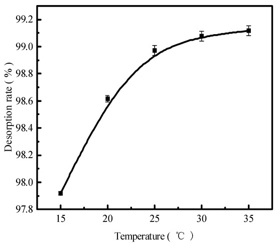 The reaction temperature is also an important factor affecting the desorption effect of the desorbent on pollutants. Figure 6 presents the results in terms of the phosphorus desorption rate. The desorption rate and the amount of desorbent desorbed for a liquid–solid ratio of 0.15 L/g, the initial concentration of 300 mg/L of a 150 mL desorbent solution at 15 °C, 20 °C, 25 °C, 30 °C, and 35 °C for static desorption, and the static desorption in a conical flask for 12 h were determined by employing ICP to obtain the concentration of phosphorus in the solution supernatant. The phosphorus desorption rate increased with increasing reaction temperatures. At 35 °C, the phosphorus desorption rate was 99.11%, and the desorption rate stabilized above 25 °C, indicating that desorption was heat absorbing. The increase in temperature accelerated the intermolecular thermal motion and the diffusion of phosphorus because adsorption and desorption are constantly converted for the reaction to occur. Moreover, desorption is a chemical reaction process in which HCl and the adsorbent surface of phosphate dissolve the other ions while sparing the HCl action channel. This increases the contact area of the reaction and temperature, elevating the chemical reaction rate and, thus, the desorption rate. In addition, according to the previous adsorption behavior study, phosphorus adsorbed on the adsorbent of red mud particles is an attached state, with only hydrogen bonding forces and van der Waals forces acting on it. Consequently, the rate at which phosphate escapes the system will increase as a result of the temperature increase intensifying the molecular movement.