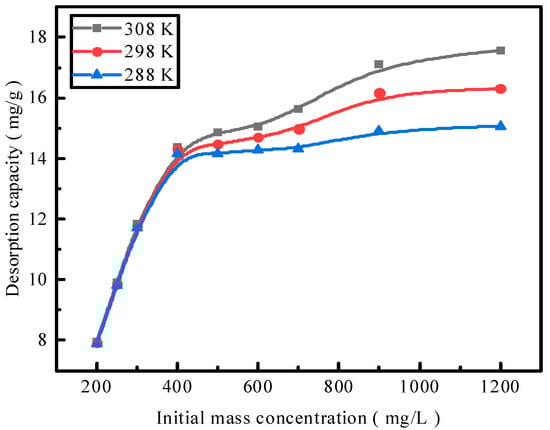 Desorption curves at different temperatures are nonlinear and can, therefore, be fitted using the Freundlich and Langmuir adsorption isotherm equations [25]. The isotherms reveal the interaction between (i) the adsorbent and desorbent and (ii) the adsorbate at the interface of the two phases to obtain the desorption properties and mechanism [26]. The D–R model provides the ideal state, assuming that the adsorbent pore space is filled with solute. The Freundlich adsorption isotherm model (Equation (6)) and the Langmuir adsorption isotherm model (Equation (7)) were employed to analyze the adsorption isotherms.