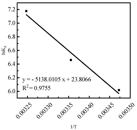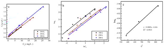 To further investigate the effect of temperature on phosphorus desorption, thermodynamic parameters were utilized to reflect the desorption characteristics. The desorption thermodynamic curves of versus were numerically fitted using Equations (9)–(12) (Figure 9 and Table 2).