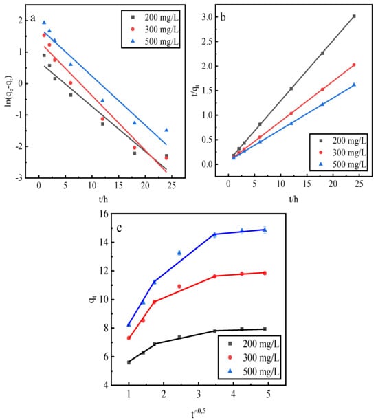 This study employs a pseudo-first-order kinetic linear model, a pseudo-second-order kinetic linear model, and an intraparticle diffusion model to fit the phosphorus kinetic properties of adsorption by the desorbent desorption of activated red mud adsorbents. After adsorption with the different initial concentrations of 200, 300, and 500 mg/L, the activated red mud adsorbents were dried at 105 °C for 2 h. The desorbent was 0.2 mol/L HCl, and the desorbent and adsorbent solid–liquid ratio was 0.15 L/g. Static desorption was conducted at a constant temperature of 35 °C in conical flasks for 1, 2, 3, 6, 12, 18, and 24 h. The fitting results are presented in Figure 10 and Table 3.