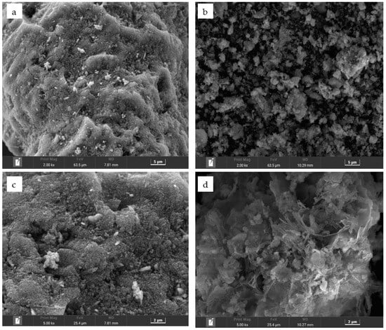 Scanning electron micrographs of the surface of activated red mud adsorbents before and after desorption. (a,b) Before and after desorption at 5 m, respectively. (c,d) Before and after desorption at 2 m, respectively.