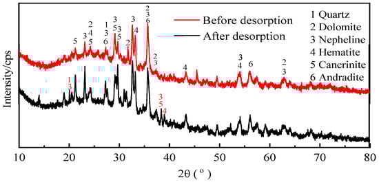 Figure 13 shows the mineral composition of the activated red mud adsorbent before and after desorption. With desorption, the intensities of the characteristic peaks of the chalcopyrite, calcium chalcopyrite, and calcium–iron garnet considerably decreased. This result is related to the disintegration and dissolution of elements such as Ca, Fe, and Si during phosphorus desorption in water. Variations in the crystal type and mineral composition are inconsiderable, indicating that the activated red mud adsorbents can continue to adsorb phosphorus after desorption. Thus, the adsorbents may be reused.
