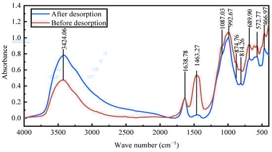 Fourier-transform infrared spectroscopy was conducted to examine the changes in the structure and chemical groups of the activated red mud adsorbent with desorption. The goal was to verify the phosphorus fugacity state on the activated hematite particulate adsorbent from 400 to 1500 cm−1. Figure 14 presents the spectral maps before and after desorption. After desorption, the peaks at 992 cm−1 were considerably strengthened primarily by the Si(AlIV)–O telescopic vibration as shelly silicate or chalcocite, which was consistent with the increase in the Si content (EDS results). The peaks at 814, 874.76, and 1463 cm−1 disappeared, the main desorption agent led to the dissociation of Ca and Fe, and the vibrations of the [SiO4]4− functional groups of the calcium–iron garnet and calcite or aragonite basically disappeared. The peaks at 3600–3000 cm−1 were due to water crystallization, indicating that desorption was accompanied by water desorption. Overall, the material changes before and after desorption were clearer than before desorption, especially for Ca and Fe compounds. After desorption, the intensities of the strong peaks for PO43− groups at 1087.03 and 572 cm−1 substantially decreased [22], indicating that the desorption of phosphorus from the activated red mud adsorbents was accompanied by a chemical reaction.