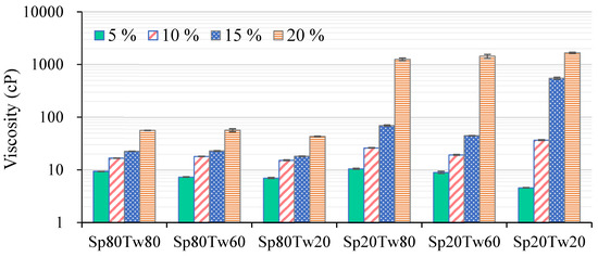 Viscosities of emulsions containing 20% w/w ostrich oil and 5, 10, 15, or 20% w/w Span (Sp) and Tween (Tw) mixed emulsifiers.