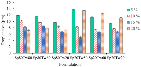 The droplet size of oil dispersion in emulsions is depicted in Figure 4. The results demonstrate that as the concentrations of the Span and Tween mixture increased from 5% to 15% w/w, there was a gradual reduction in emulsion droplet size. This phenomenon can be attributed to the increased reduction in surface tension between oil and water, leading to a decrease in interfacial free energy. The emulsifier plays a crucial role in both droplet break up and recoalescence by lowering interfacial tension and preventing immediate recoalescence [27,28]. The emulsion containing 20% w/w ostrich oil emulsified with a 15% w/w mixture of Span 20 and Tween 80 exhibited the smallest droplet size (5.01 ± 0.43 μm), as shown in Figure 4. Additionally, this emulsion formulation achieved a creaming index of 0.00% (Table 4), indicating a high level of confidence in the precision of the results. This underscores the effectiveness of the emulsifier mixture in achieving fine droplet sizes and enhancing the stability of the emulsion.