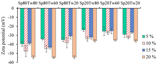 The zeta potential, representing electric charges on particle surfaces, serves as a crucial parameter for assessing emulsion stability. In this study, the zeta potential values for all emulsions consistently exhibited negative charges. According to previous research [14], a stable emulsion is achieved when the mutual repulsion among emulsion droplets surpasses attractive forces. Examining the zeta potential values in Figure 7, it was observed that the emulsion stabilized with a 5% w/w concentration of Span 20 and Tween 80 displayed the highest zeta potential value (−23.97 ± 1.94 mV). Conversely, the emulsion stabilized with a 20% w/w concentration of Span 80 and Tween 60 exhibited the lowest zeta potential value (−4.68 ± 1.05 mV). Notably, negative zeta potential values in the emulsions were attributed to the carboxyl group of fatty acids present in ostrich oil.