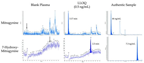 LC-MS/MS chromatograms of blank plasma, plasma fortified at the lower limit of quantification (0.5 ng/mL) for mitragynine and 7-hydroxymitragynine and an authentic plasma sample collected at 1.33 h after the participant received 13.3 mg of mitragynine in 1000 mg of dried kratom leaf, achieving plasma concentrations of 46 ng/mL of mitragynine and 7.3 ng/mL of 7-hydroxymitragynine. Arrows in the blank chromatogram indicate retention time of mitragynine and 7-hydroxymitragynine.