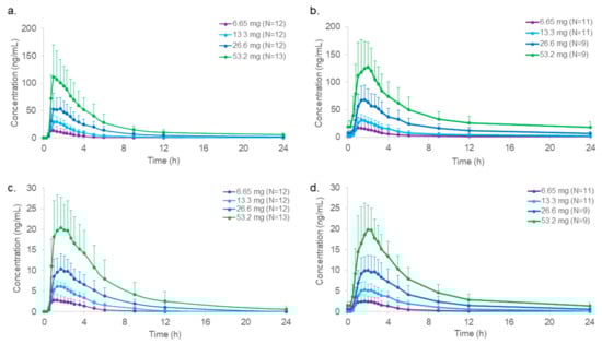 Mean plasma concentration profiles of (a) mitragynine (including standard deviation bars) after a single dose (SD); (b) mitragynine after 15 multiple doses (MD); (c) 7-hydroxymitragynine after an SD; (d) 7-hydroxymitragynine after 15 MD mitragynine for all four dried kratom leaf powder doses. Each dose was administered to a different cohort of healthy male and female subjects.
