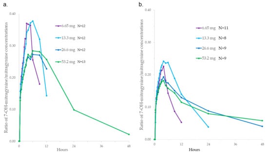 7-hydroxymitragynine to mitragynine ratios were always higher after SD than MD, and the highest ratios were consistently after lower doses. Across the concentration–time profile, ratios generally increased to a maximum and then decreased over time. The decrease reflects the shorter half-life of the metabolite compared to the parent compound. The range of the median Cmax ratios observed at the top two doses was 0.18–0.21, which was similar to the median of 0.27 previously reported in a small number of subjects [27].