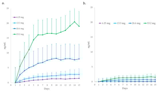 Trough plasma (a) mitragynine and (b) 7-hydroxy-mitragynine concentrations (including standard deviation bars) on days 1–15 of consecutive 6.65–53.2 mg mitragynine doses in dried kratom leaf powder during the attainment of steady-state concentrations.