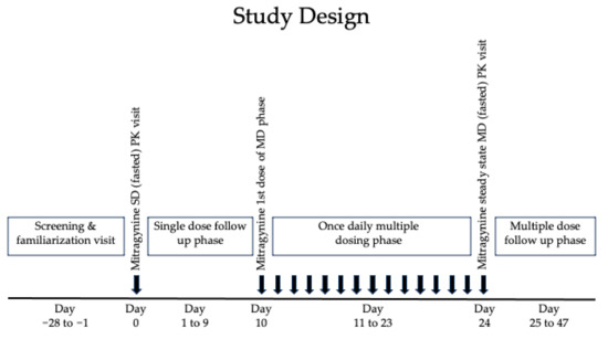 Blood collections (total 484 mL) for the mitragynine and 7-hydroxymitragynine concentrations occurred prior to and 0.25, 0.5, 0.75, 1, 1.33, 1.67, 2, 2.33, 2.67, 3, 3.5, 4, 5, 6, 9, and 12 h after the single dose and after the 15th multiple dose. Participants returned to the clinic 24, 48, and 72 h—and 5, 7, and 10 days—after the SD for the daily post-dose blood collection. Participants fasted for ≥10 h prior to the pre-dose blood collection. Standardized meals were provided 4 and 10 h after the morning dose. Follow-up visits for MD occurred 1, 2, 3, 5, 7, 10, 16, and 23 days later, with a single blood collection in the morning. The follow-up phase began 24 h after the last MD, day 25, and ended on day 47 (end of study, EOS).