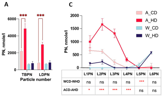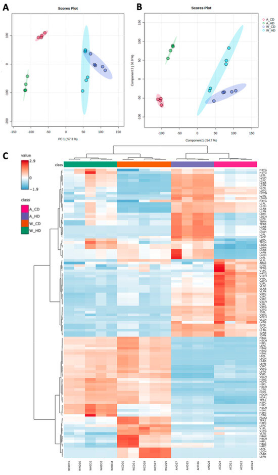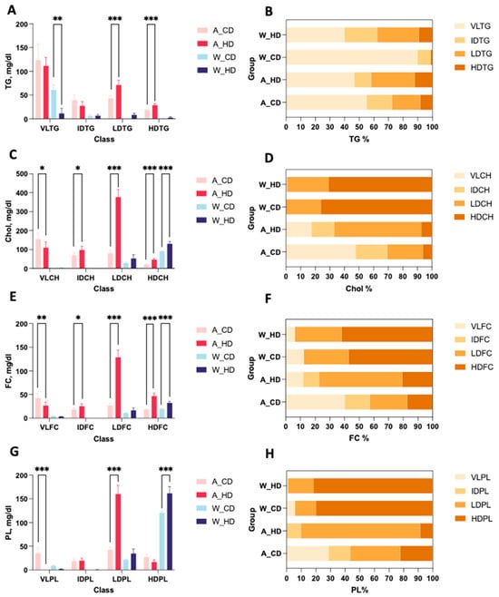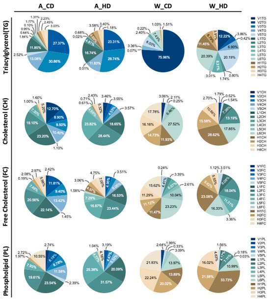 2.3. The Abundance and Distribution of Lipids in the VLDL, LDL, and HDL Subclasses Were Distinct in High-Fat-Treated ApoE-/- and Wild-Type Mice