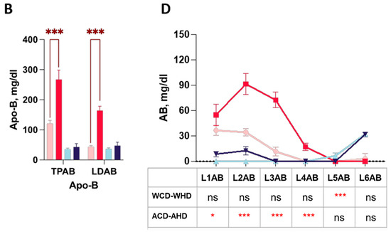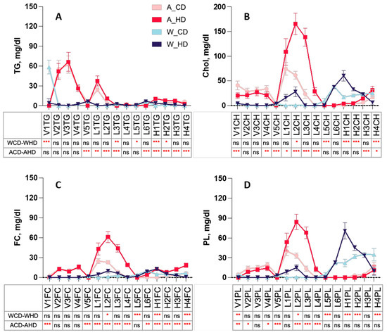2.2. The Abundance and Distribution of Lipids in the Lipoprotein Class Were Distinct in High-Fat-Treated ApoE-/- and Wild-Type Mice