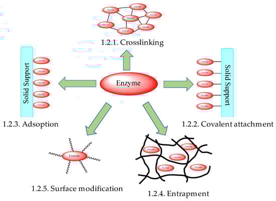 In an attempt to circumvent these unfavorable traits, enzyme immobilization is often employed, whereby enzymes are crosslinked, attached to a support, embedded in a polymeric network, encapsulated, or chemically modified (Figure 1).
