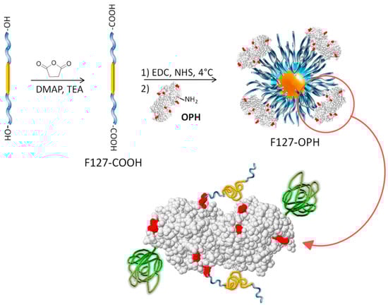 Conjugation of carboxy-terminated Pluronic 127 to organophosphorus hydrolase (OPH) through sequential modification with 1-Ethyl-3-(3-dimethylaminopropyl)carbodiimide (EDC) and N-hydroxysuccinimide (NHS). Reproduced with permission from [91]. Copyright (2014) American Chemical Society.