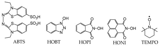 Selected mediators. 2,2′-azino-bis(3-ethylbenzothiazoline-6-sulfonic acid), ABTS; 1-Hydroxybenzotriazole, HOBT; N-hydroxyphthalimide, HOPI; N-hydroxynaphthalimide, HONI and 2,2,6,6-tetramethylpiperidine-N-oxyl, TEMPO.