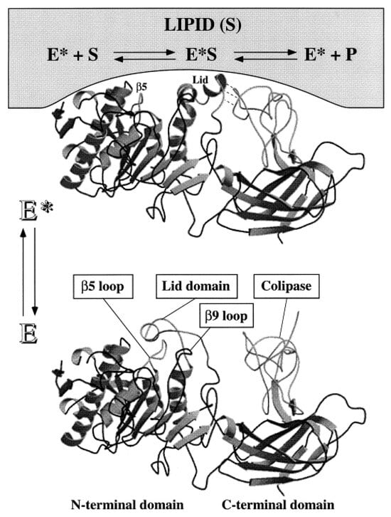 - Carrière, F.; Withers-Martinez, C.; Van Tilbeurgh, H.; Roussel, A.; Cambillau, C.; Verger, R. Structural basis for the substrate selectivity of pancreatic lipases and some related proteins. Biochim. Biophys. Acta Rev. Biomembr. 1998, 1376, 417–432. [Google Scholar] [CrossRef]