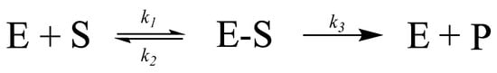The chemical kinetics of an enzyme-catalyzed reaction are most often described using the Michaelis–Menten model, first proposed in 1913 [11]. In this model, the enzyme € and substrate (S) reversibly bind with the rate constant k1, forming an enzyme–substrate complex (ES) (Scheme 1). The formed complex can then either unbind (rate constant k2) or progress further in the reaction (rate constant k3), producing the product (P) and free enzyme, which may further react with an additional substrate.